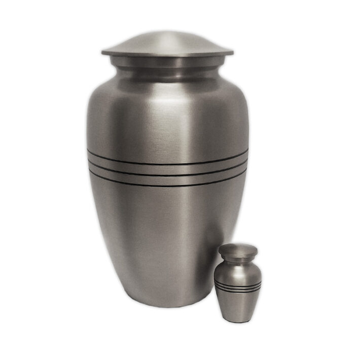 This classic pewter brass urn is elegantly understated with three fine black bands encircling the midsection – a dignified and timeless tribute to a cherished life.